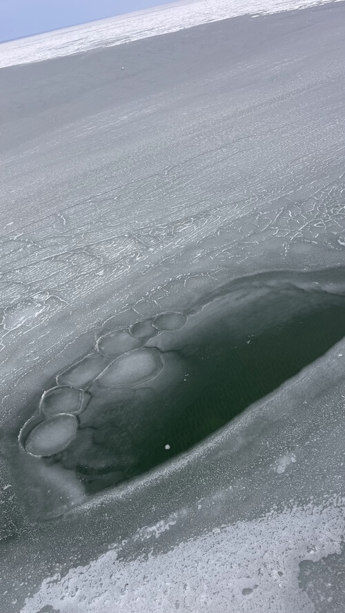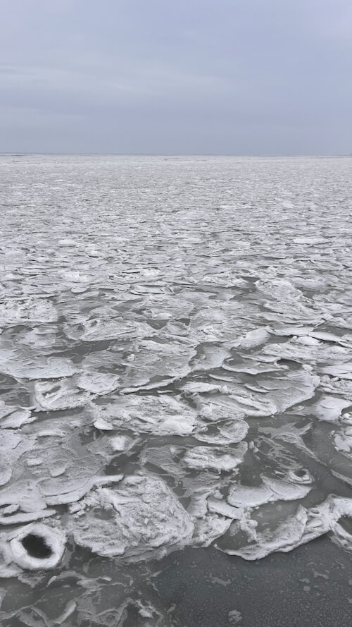 Das alles sind bloß vorbereitende Worte für das, was ich mit Worten nicht auszudrücken vermag. Das Gefühl, an einem zugefrorenen Meer zu stehen. Die Stille. Die Farbe. Die sensorischen Eindrücke, die mein Ich so nicht kannte. Ein komplett neues Erlebnis – und damit einhergehend ein wahnsinnig starkes Gefühl, LEBENDIG zu sein.