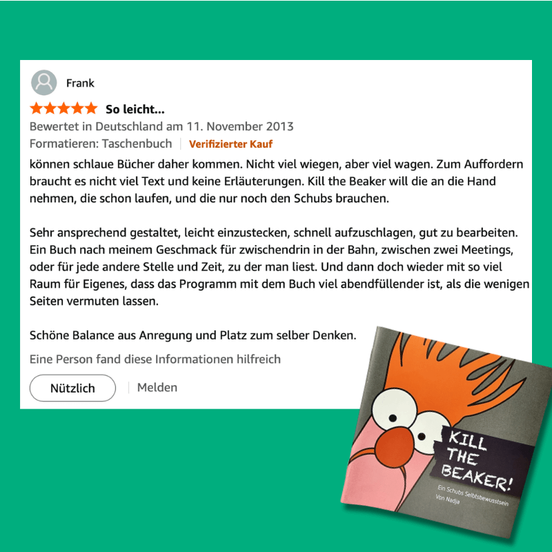 "Kill the Beaker macht auf leichte Weise Mut, all die Dinge, die wir "immer schon mal" machen wollten - oder auch nur eins davon - endlich anzugehen. Es ist ein Mitmach-Buch, das dazu animiert, sich selber im Kleinen wie im Großen auszuprobieren, Selbstbewusstsein zu sammeln und zu seinen Träumen zurückzufinden. Durch seine kompakte Größe eignet es sich dabei hervorragend, immer und überall dabei zu sein, bis es bei Erreichen eines Ziels ganz bekritzelt, zerknittert und abgegriffen sein darf. Und für seinen nächsten Traum kauft man sich dann ein neues ..."